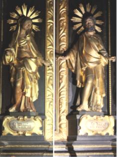 Die Seitenfiguren, Zacharias und Elisabeth, in Gold gefasst, im Stil des ausklingenden Barockmanierismus, sind Arbeiten des Bildhauers Michael Zürn (1636-1671)